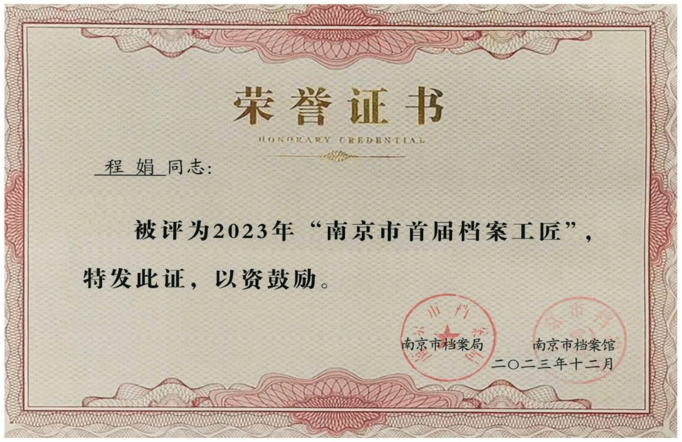 根据南京市档案局、档案馆《关于开展南京市档案专业技能竞赛暨首届“档案工匠”选拔工作的通知》精神,通过个人申报、单位审核、组织推荐、理论考试、技能竞赛、专家评审、选拔工作领导小组研究等程序,我校档案馆程娟老师凭借深厚的档案管理知识和扎实的档案专业技能,经过激烈角逐,最终获评“南京市首届档案工匠”荣誉称号。