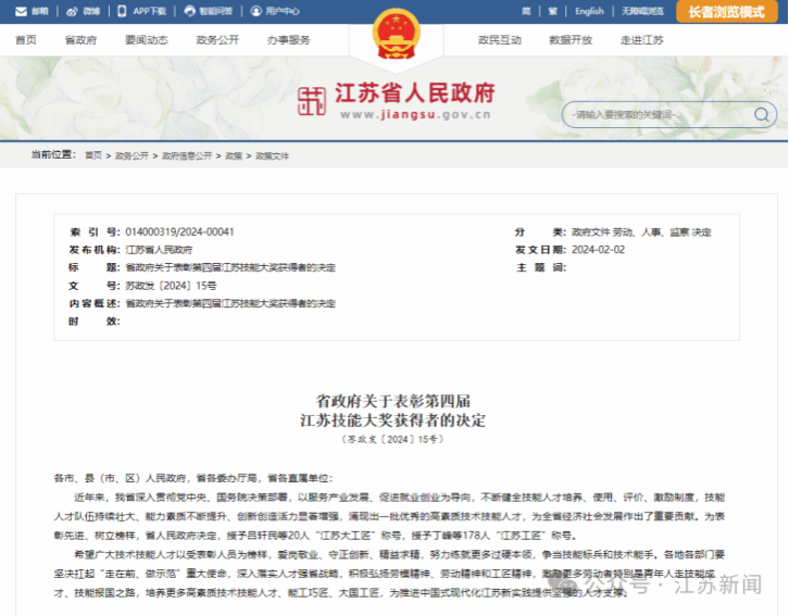 本次评选表彰的是为全省经济社会发展作出重要贡献的优秀高素质技术技能人才,共授予“江苏大工匠”称号20人、“江苏工匠”称号178人。省政府授予罗响校友此项殊荣,在一定程度上是对我校高素质应用型人才培养的充分肯定。学校将继续落实立德树人根本任务,不断提升人才培养质量,更好服务地方经济社会发展。