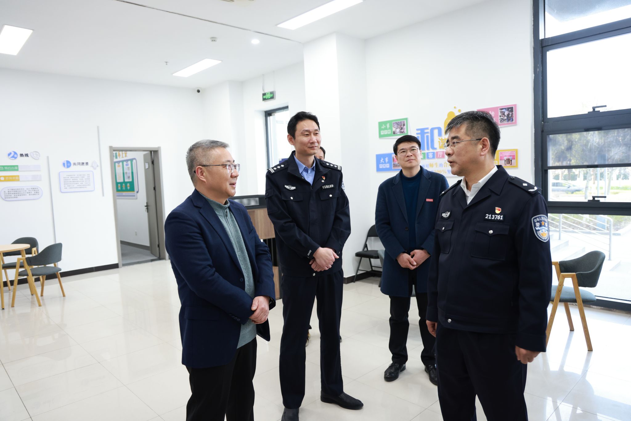 梅中亚一行参观了我校校园警务室,详细了解了警务室功能区及人员配置、运行机制、反诈宣传、矛盾纠纷化解等情况,对我校警务室建设和运行情况及校园安全稳定工作给予高度评价,要求驻校民警积极适应、主动融入新环境,实现警校协作、警务前移的工作目标。梅中亚强调要强化服务意识,要发挥公安部门专业优势,深化警校合作共建,将警务室打造成校园安全管理第一阵地和服务师生的第一窗口,为学校的安全稳定和持续发展提供保障。