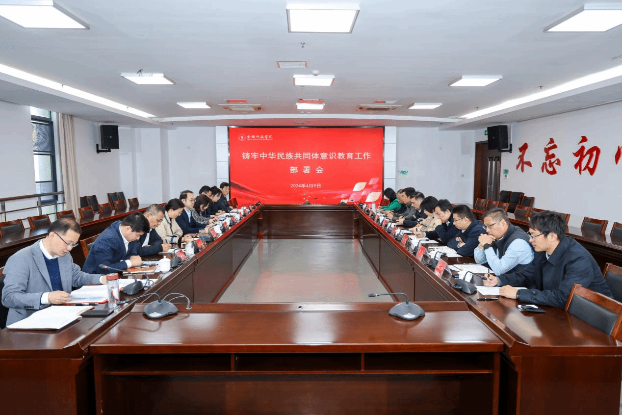 4月9日上午,我校召开铸牢中华民族共同体意识教育工作部署会,深入学习习近平总书记重要文章《铸牢中华民族共同体意识 推进新时代党的民族工作高质量发展》,审议学校2024年铸牢中华民族共同体意识教育工作方案,部署全校铸牢中华民族共同体意识教育年度重点工作任务。校党委副书记单晓峰出席会议并讲话。校党委常委、组织部部长张远凤,校党委常委、宣传部部长赵越春出席会议。校党委常委、统战部部长黄洋主持会议。