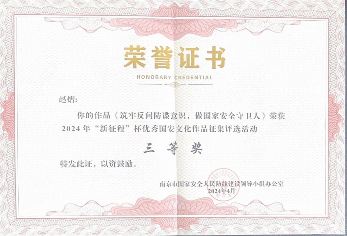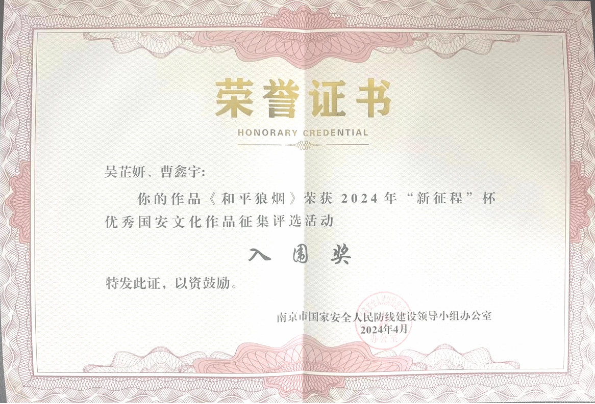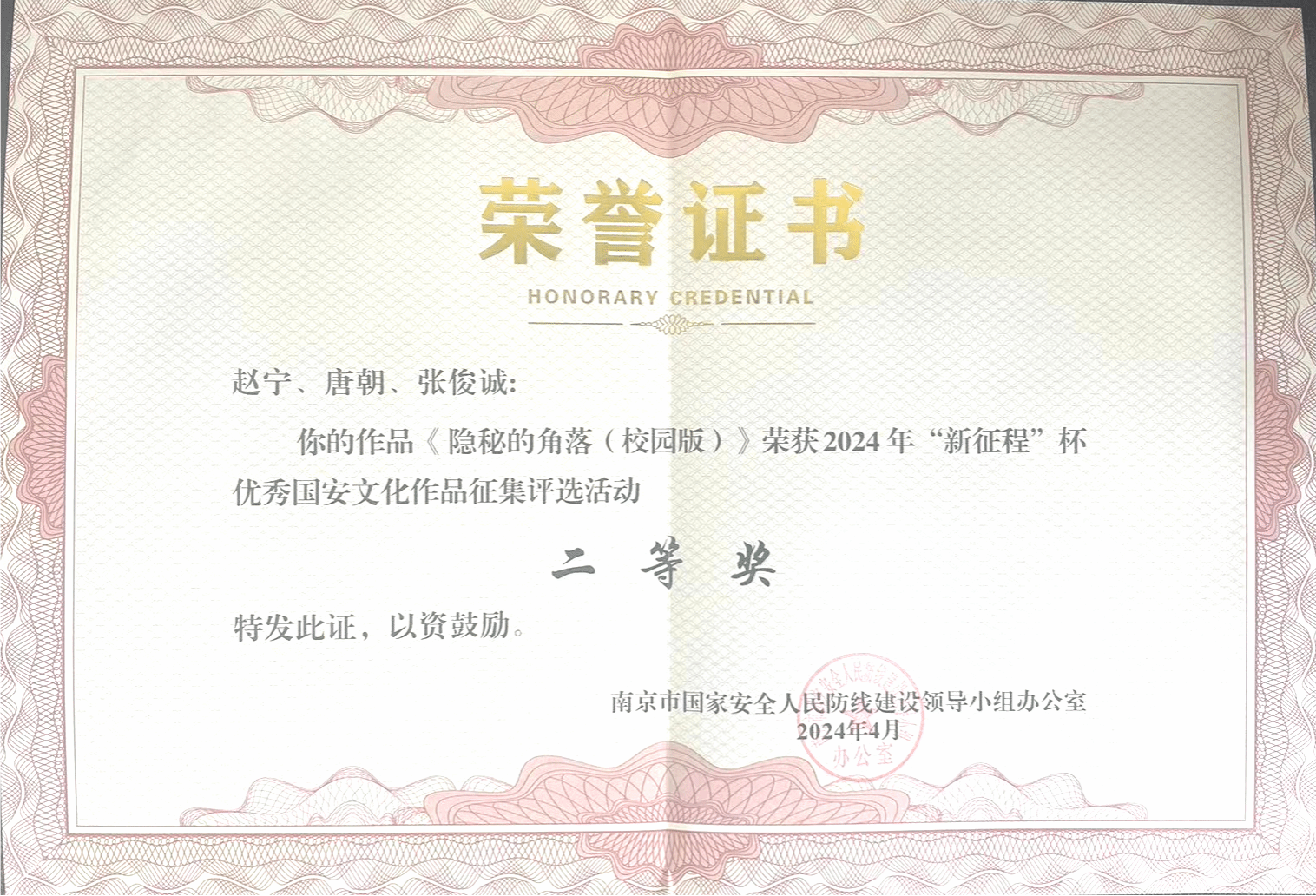 近日,南京市国家安全人民防线建设领导小组公布了“新征程杯”优秀国安文化作品征集活动结果,我校四份作品成功入选。其中,动漫学院赵宁、唐朝和学生张俊诚共同创作的微视频《隐秘的角落(校园版)》荣获二等奖,学生工作处赵熠创作的微视频《筑牢反间防谍意识,做国家安全守卫人》荣获三等奖,学生工作处宋标创作的海报《汇聚人民力量 维护国家安全》和商学院学生吴芷妍、曹鑫宇撰写的征文《和平狼烟》荣获入围奖,我校获优秀组织奖。