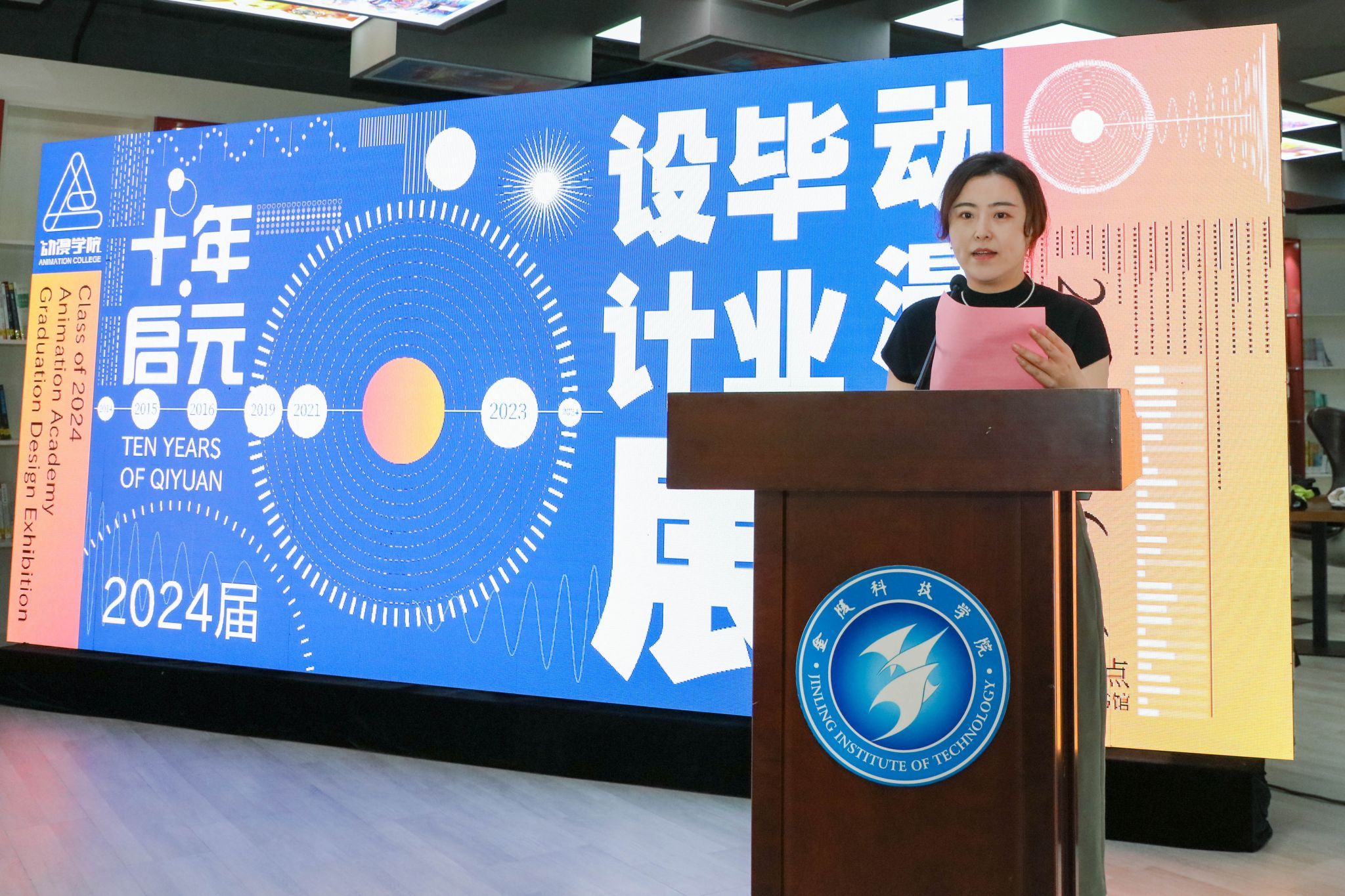 刘志远、刘永彪、张燕、顾晓燕共同启动动漫学院2024届毕业设计展开幕大屏。