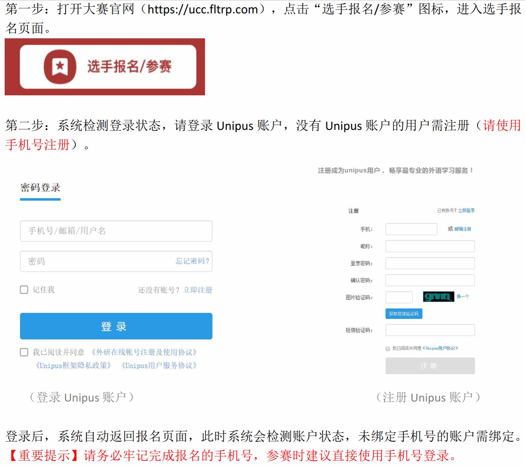 1. 所有参加初赛的学生请自行在大赛官网(https://ucc.fltrp.com)“选手报名/参赛”页面进行报名中报名,并填写相关信息。