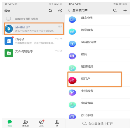 一、微信企业号里打开“金科院门户”,点击“微门户”,如下图所示: