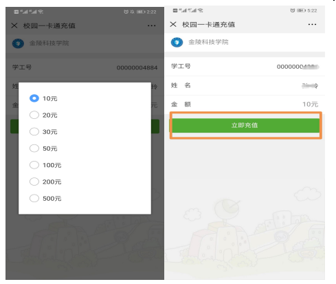 二、点击“公共服务”中的“校园卡充值”,输入姓名、选择充值金额,输入完成后,选择立即充值,如下图所示: