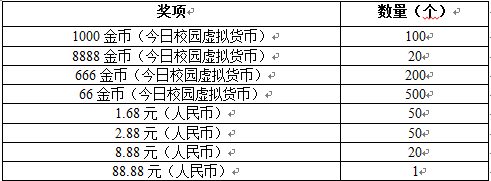 奖项二——优质问卷奖:采用评选的方式,评选组织为本次活动的评委组(由学校校办、学工处、工会、信息中心、教师代表、学生代表、校外代表等多部门组成),以集体投票的形式从问卷中选出优质问卷奖教师和学生各60名,每人将获得价值50元电话充值卡一张。