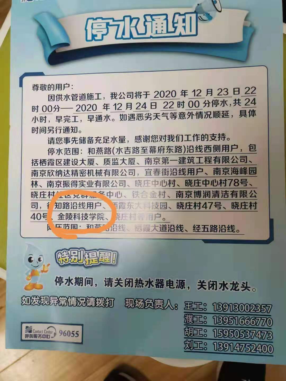 接南京水务集团通知,因供水管道施工,将于2020年12月23日22时00分——2020年12月24日22时00分停水,共24小时,早完工,早通水。如遇恶劣天气等意外情况顺延,具体时间另行通知。