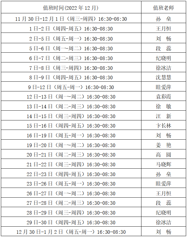为了更好地服务广大同学,我校在疫情期间开通24小时心理咨询热线,现将12月值班安排公布如下:
