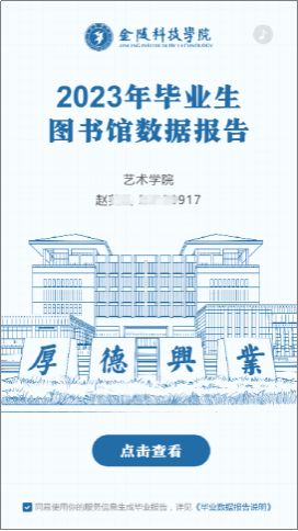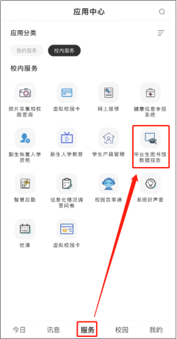 查阅报告请点击今日校园app里“服务”里的“毕业生图书馆数据报告”。