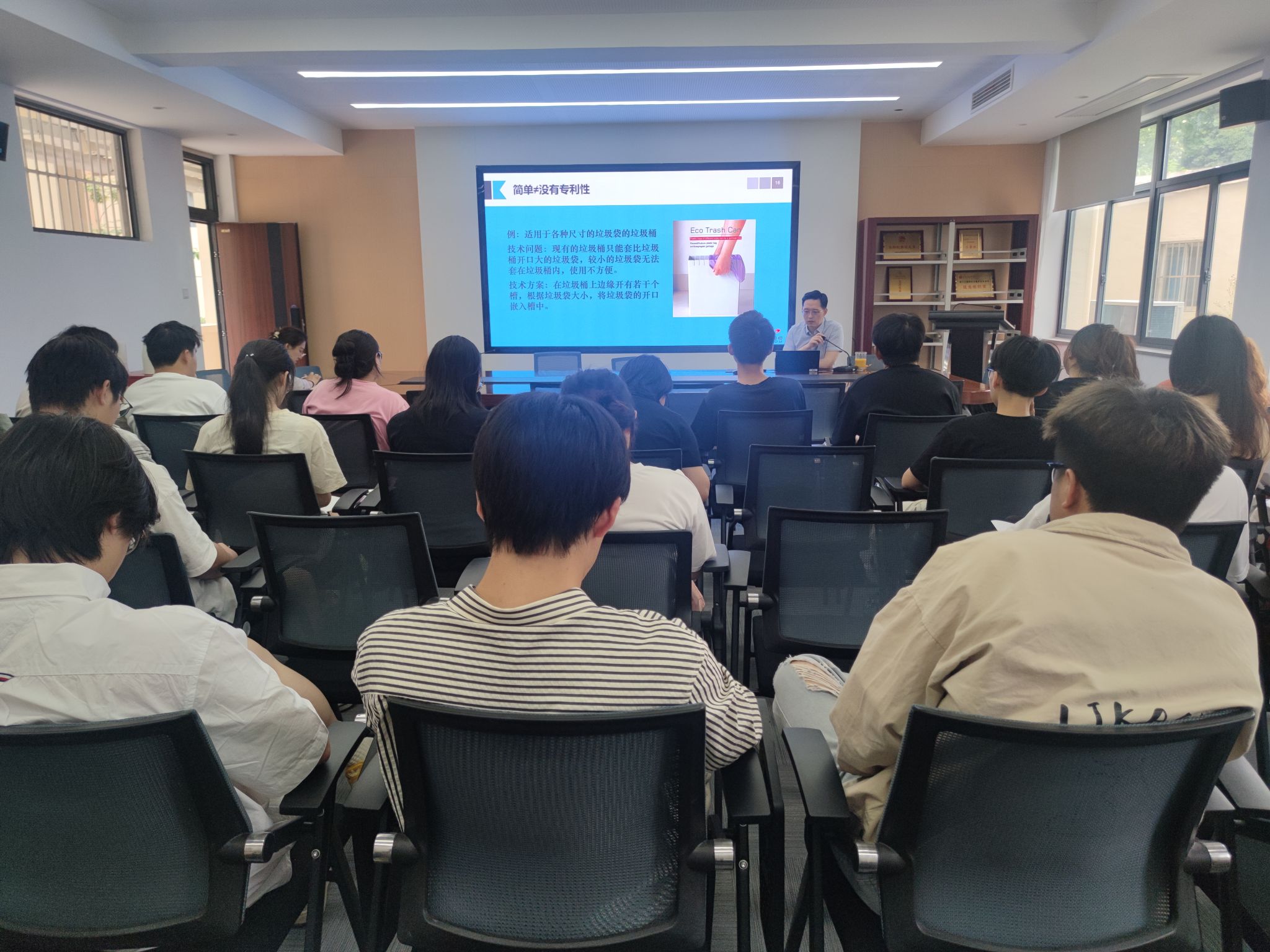 此次讲座中,胡律师从专利的概论、专利的撰写、专利的检索三个方面进行了详细的讲述。首先,胡律师利用各种国内外申请专利的案例为大家生动形象的讲解了什么是具有实用性、创造性、新颖性的专利,以及大家在科研过程中,日后的功作生活中需要从怎样的角度来创新性的解决问题。接着对专利的本质“公开换保护”进行了解释,促使大学生对国家专利申请的形势意义产生深刻清晰的认知。最后,胡律师为同学们讲解了如何进行专利的检索及撰写并推荐了相关网站。