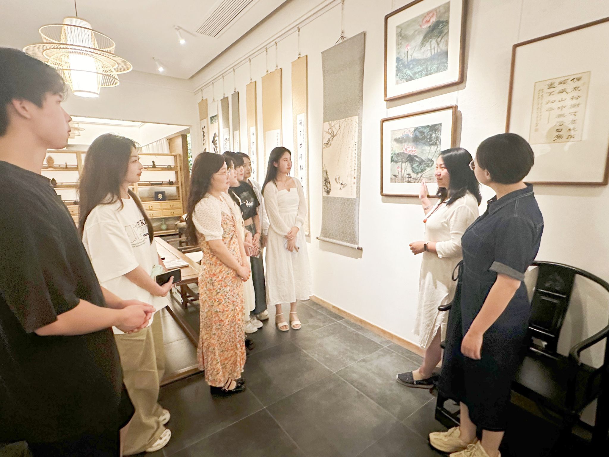 活动现场,李星和学生们围坐在一起,品尝着清淡而健康的素食,氛围轻松愉快。在品书画环节,李星向学生们讲解了多幅中国古代书法和绘画作品,透过艺术的形式传达了教育与美学的内在联系。她提到,艺术不仅是审美的享受,更是心灵的熏陶,希望学生们能在忙碌的学习生活中,也不忘培养对美的感受力和创造力。