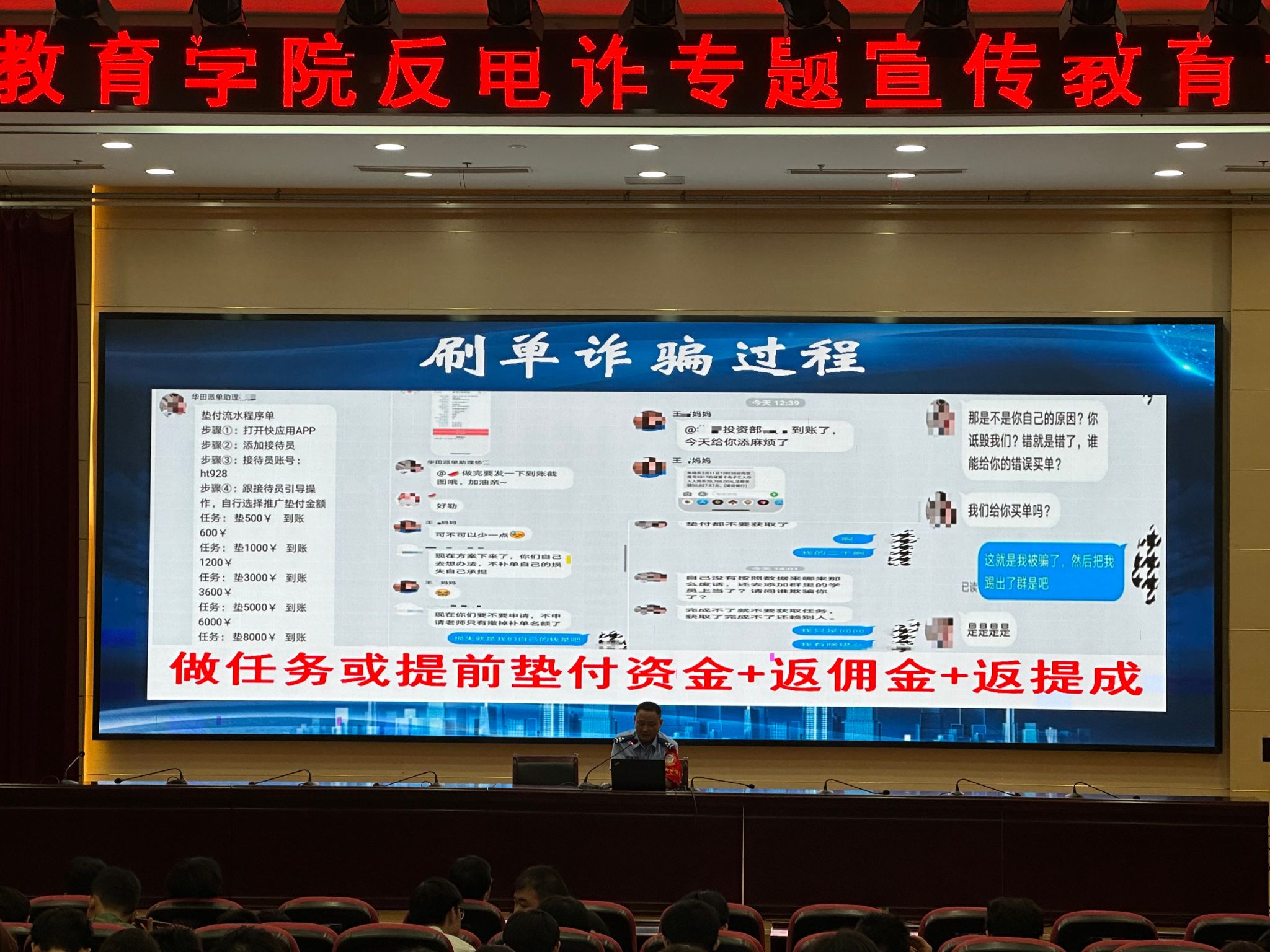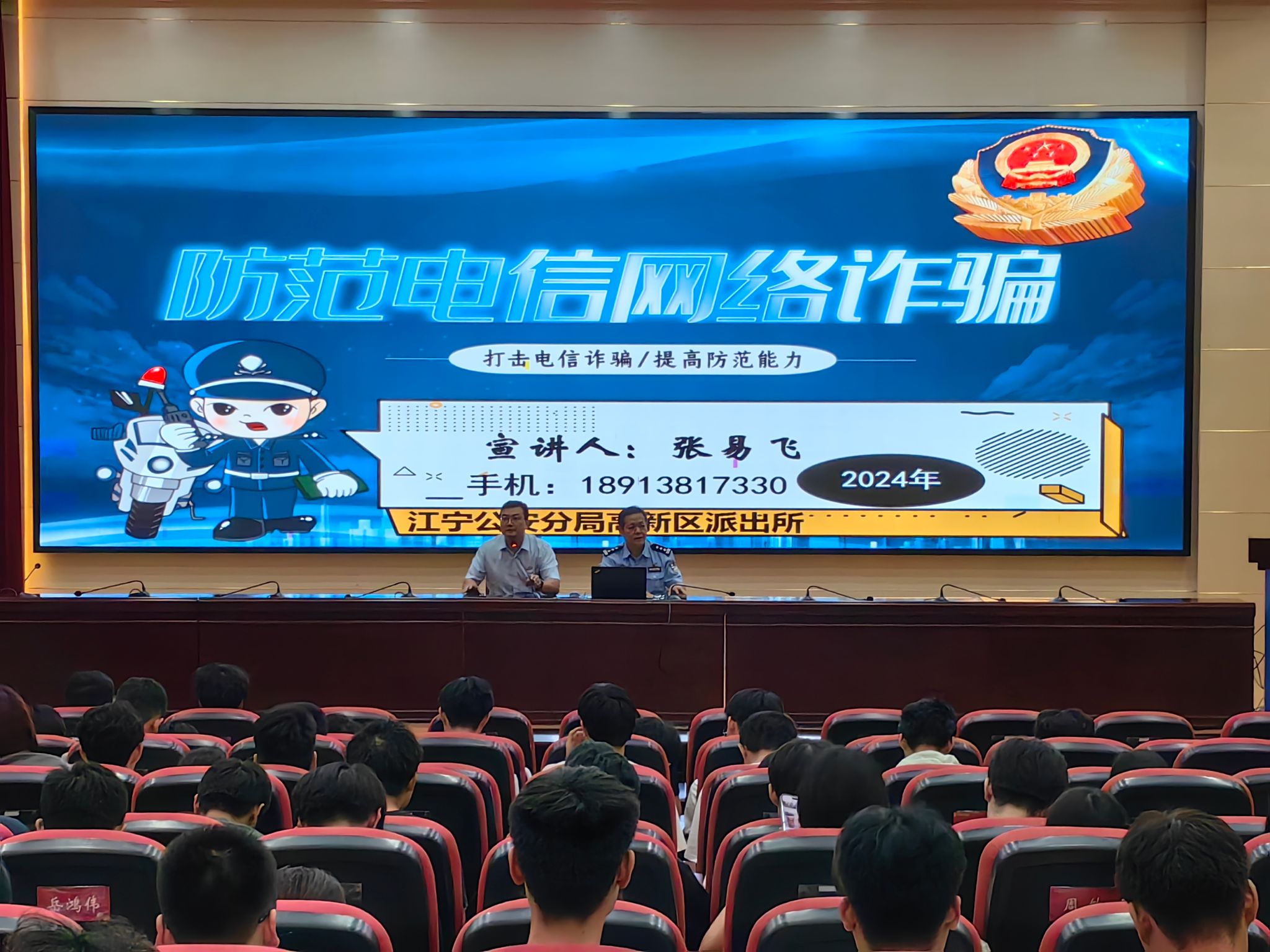 为进一步增强学生反诈意识,提升反诈能力,9月26日晚,国际教育学院在科技楼报告厅举办了防范电信网络诈骗教育专题讲座,活动邀请了驻校民警进行宣讲。国际教育学院党总支部书记刘琳、辅导员李向前及2022、2023级的全体学生参加了此次讲座。