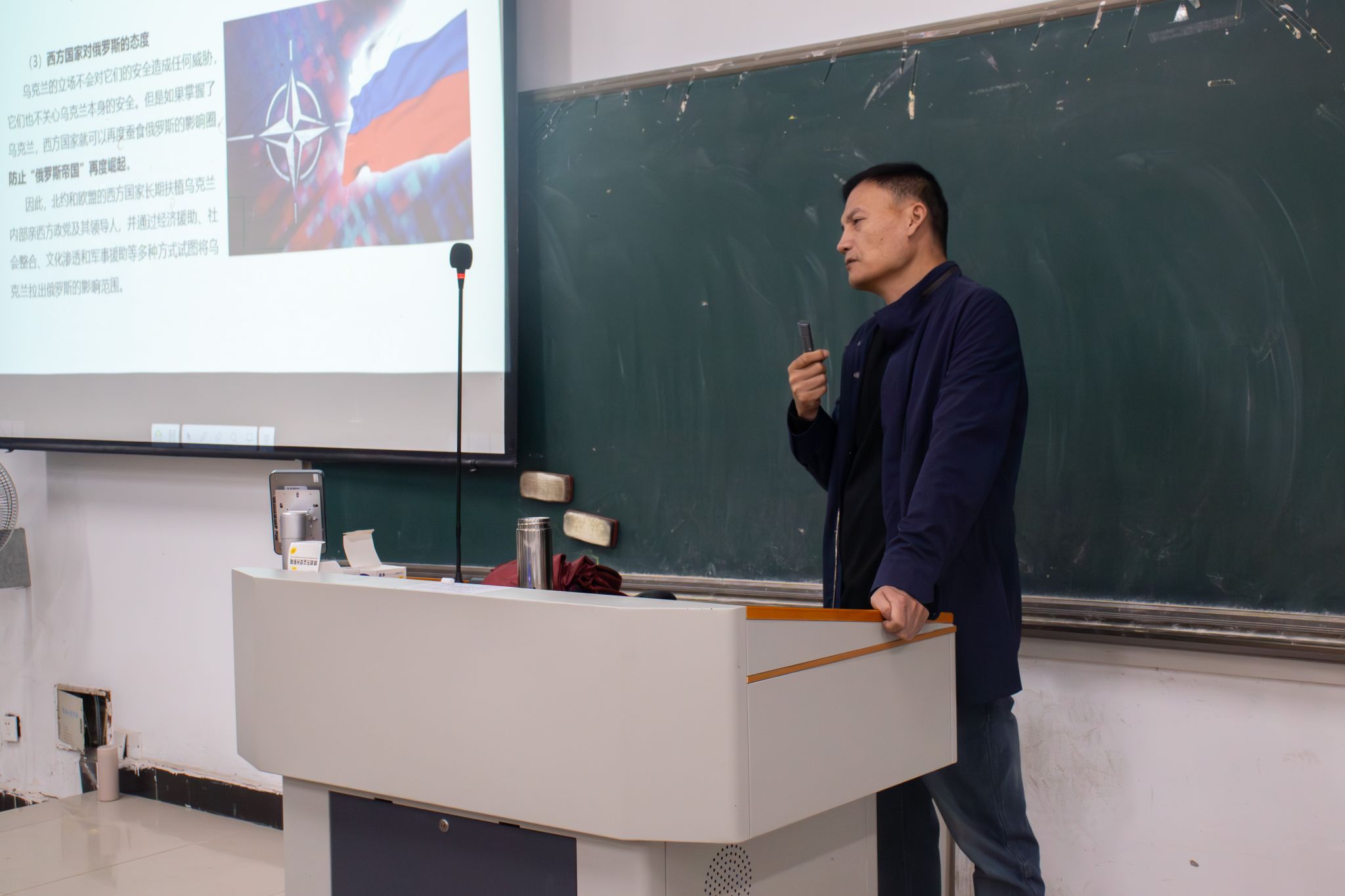 在“当前国际形势和中国外交工作”讲座中,周老师从乌克兰危机、新一轮巴以冲突和中国的大国担当三个板块进行讲授,从乌克兰危机和巴以冲突的历史经纬和现实原因出发,根据实际情况深入浅出地阐述了俄乌冲突和巴以冲突的变化及国际影响,最后深入剖析了我国的立场和作为。他指出,中国始终是世界和平的建设者,国际秩序的维护者,坚持和平的外交政策。