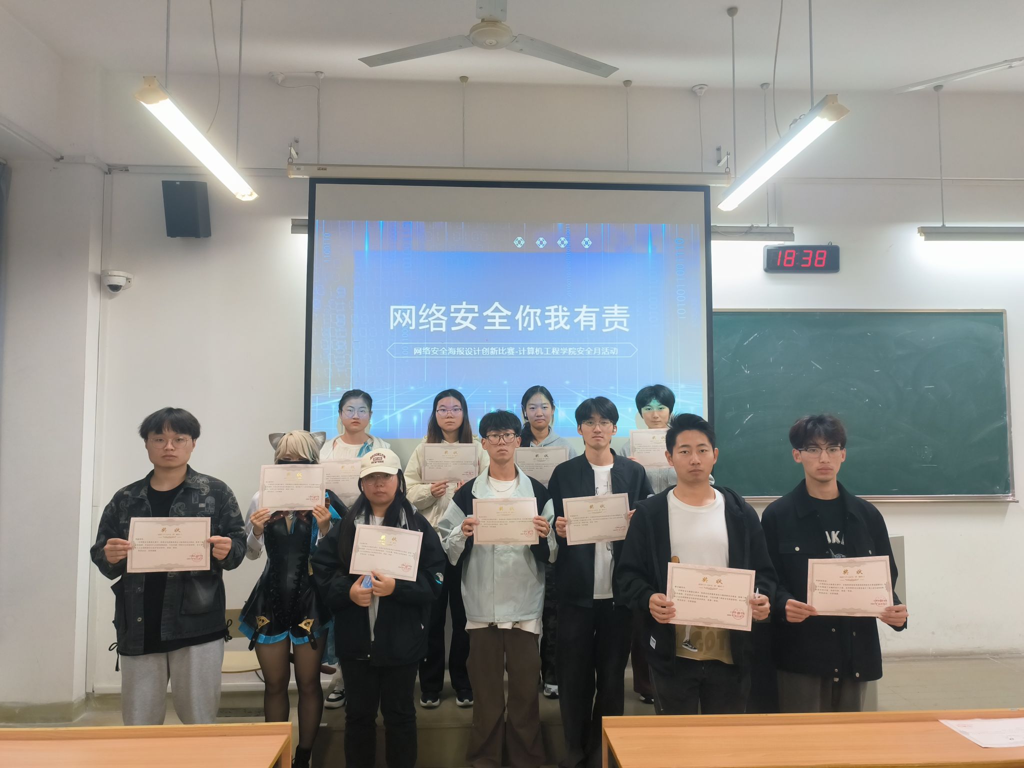 本次大赛面向计算机工程学院全体学生征集以海报和漫画为主要形式的作品。参赛者通过生动的图像和鲜明的色彩,将网络安全的重要性及防范技巧融入其中。比赛共收到作品19 幅,经过线上线下评比共选出一等奖 2 名,二等奖 4名,三等奖 8 名。由学院向获奖选手颁发了奖品和奖状。