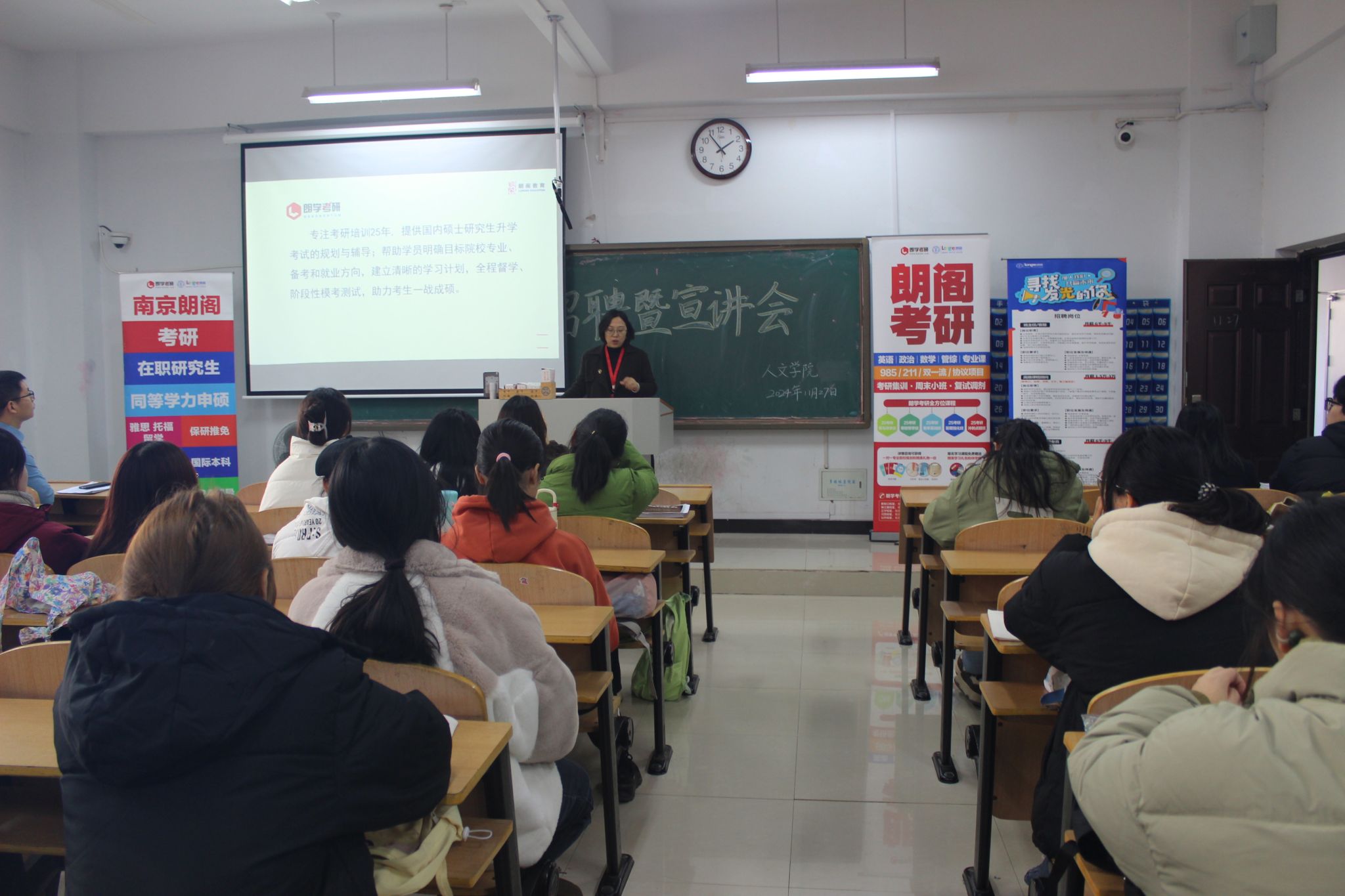 为了帮助大学生做好职业生涯规划,助力2025届毕业生顺利就业升学。11月27日下午,在幕府校区图教楼210,人文学院校企合作单位朗阁教育集团举办了秋季就业升学宣讲会,朗阁教育集团(朗学考研)总经理张引成、人事总监刘晓梅、高级留学顾问高雷担任主讲,全院100余名学生代表参加了宣讲会。