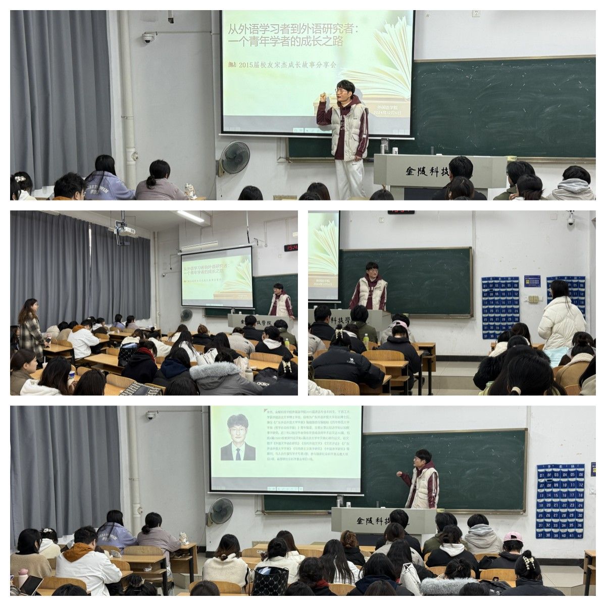 12月6日,外国语学院2015届优秀校友、广东外语外贸大学在站博士后兼任《广东外语外贸大学学报》编辑部责任编辑的宋杰回到母校,与即将毕业的大四学生分享了他的学术成长之路及论文撰写的经验。此次活动不仅为学生们提供了一次难得的学习机会,也加深了校友与学校之间的联系。