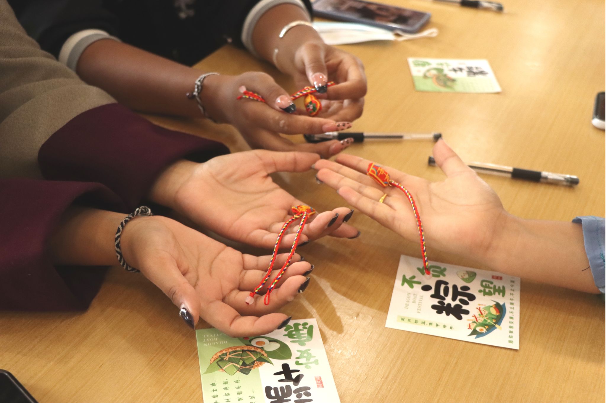 编织五彩绳同样精彩。五彩绳寓意祈福纳吉,同学们在老师的指导下,认真学习传统结绳技艺。他们全神贯注,手指灵活地穿梭在彩绳之间,将对生活的美好期许编织其中。彩线穿梭间,平安结、小粽子等造型精美、寓意吉祥的彩绳逐渐成型。大家相互交流编织技巧,感受着传统手工艺的独特魅力,在一针一线中传承着千年非遗文化。这一根根亲手编织、传递着温暖话语的彩绳,不仅缠绕在腕间,更将各民族学生的心紧紧联结,成为增进各民族学生交往交流交融的有形纽带,无声地诉说着“美美与共”的和谐乐章。