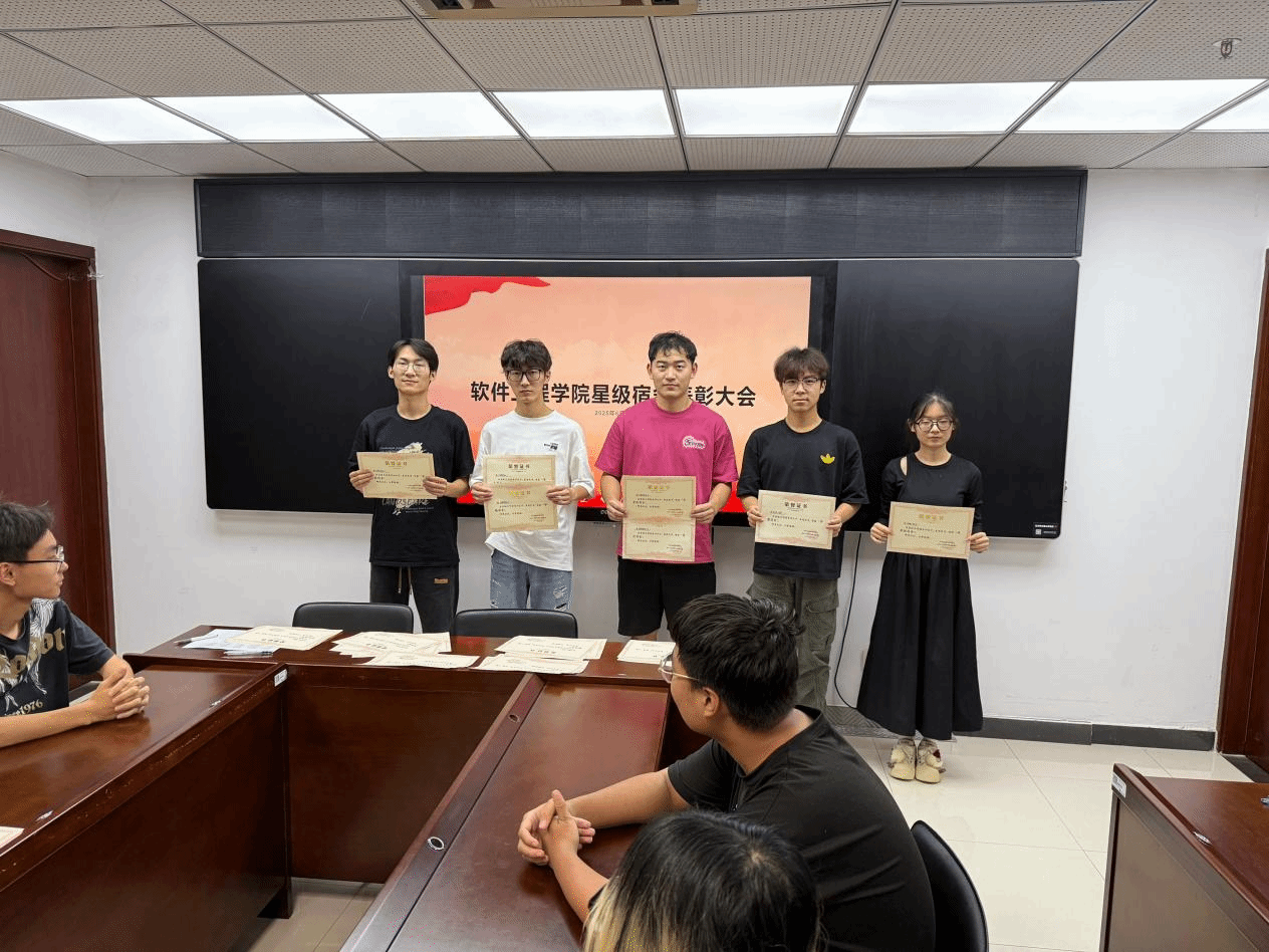 2025年6月11日18时30分,软件工程学院在科技楼2-423隆重举行院级星级宿舍表彰会,对在宿舍建设方面表现优异的宿舍进行表彰,受表彰宿舍代表学生齐聚一堂,共同见证这一荣耀时刻。