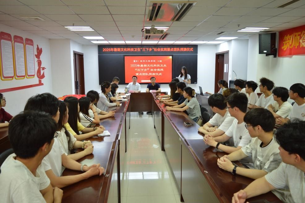 为认真学习贯彻习近平新时代中国特色社会主义思想,全面贯彻党的二十大和二十届二中、三中全会精神,深化落实习近平总书记关于青年工作的重要思想,引导青年学生上好“行走的思政课”,软件工程学院于7月4日在科技楼2-423会议室隆重举行2025年暑期文化科技卫生“三下乡”社会实践重点团队授旗仪式。学院党委书记戴军、党委副书记徐斌及全体辅导员出席仪式,各实践团队学生代表参加活动。仪式由院团总支副书记张议允主持。