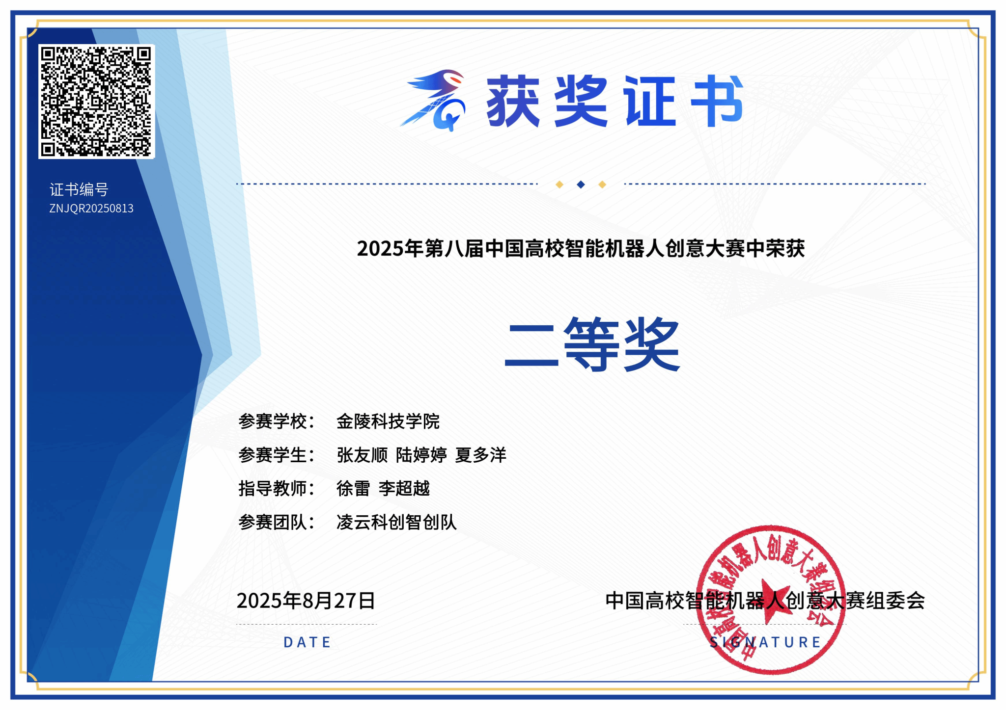 由机电工程学院AI生活“创客”班(凌云科创团队)成员张友顺、夏多洋、陆婷婷三位同学完成的作品《一种基于多模态识别的智能冰箱食材信息自动化采集与个性化健康管理系统及方法》,在徐雷、李超越老师的指导下,凭借其创新性和实用价值,先后荣获江苏赛区一等奖、全国总决赛二等奖。在全国总决赛中,团队与北京航空航天大学、哈尔滨工业大学、南京航空航天大学等752所高校的1492支队伍同台竞技,最终脱颖而出。