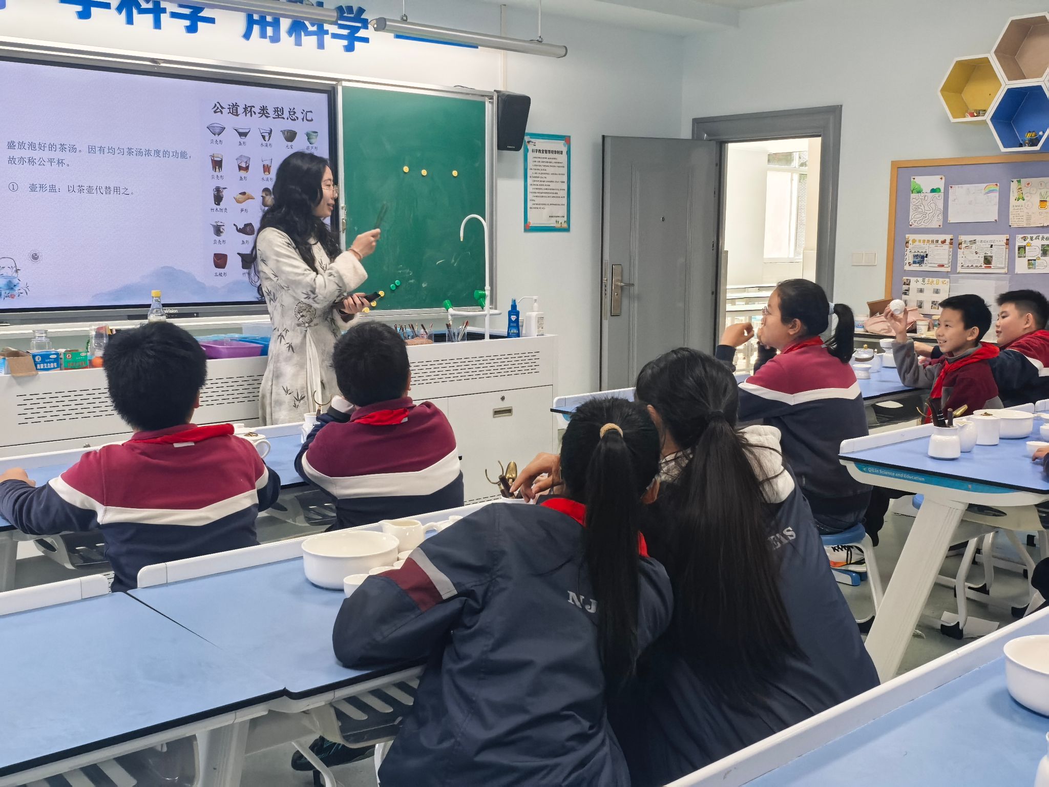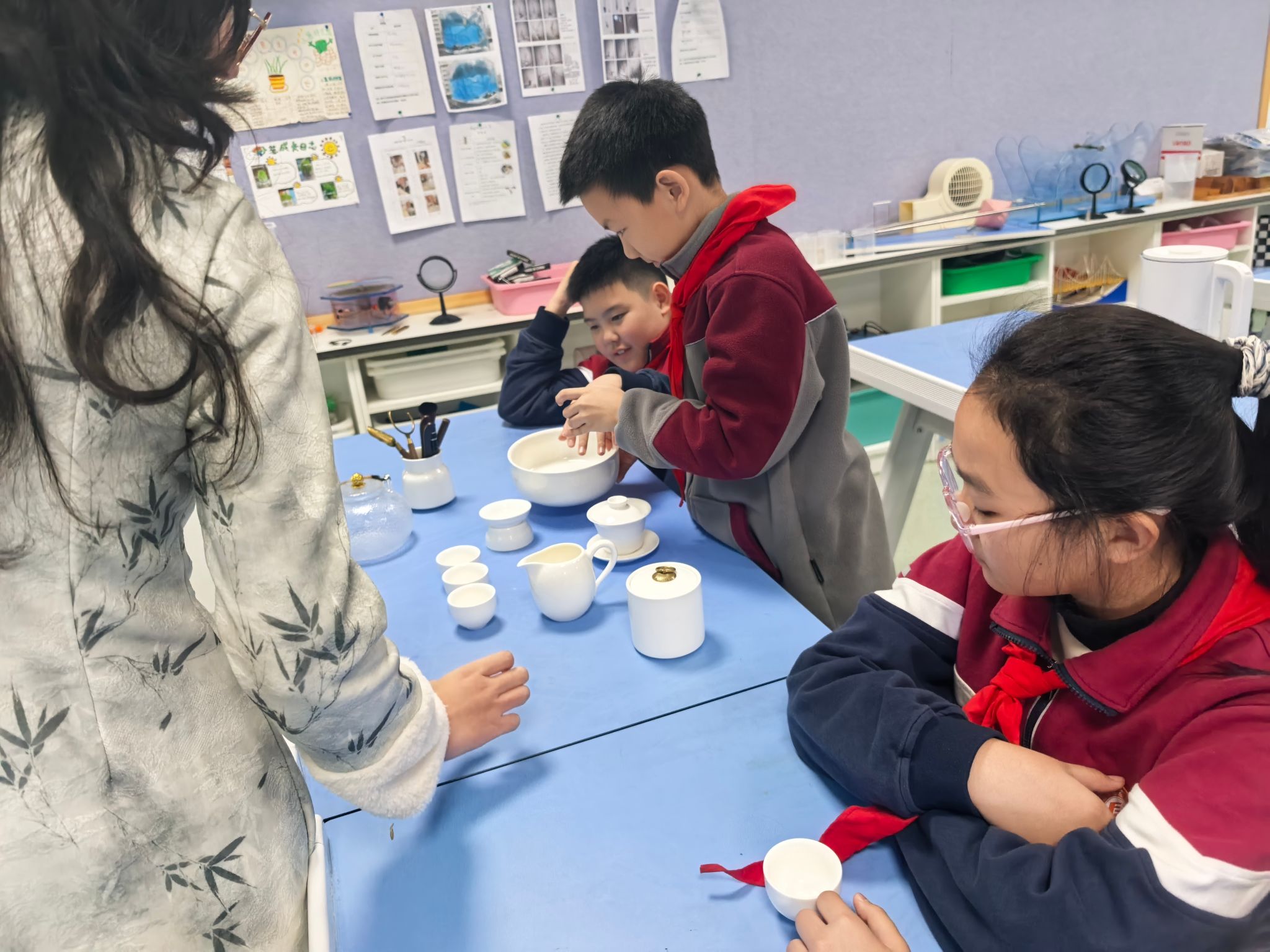 课堂伊始,大学生志愿者通过实物展示与示意图讲解,带孩子们认识盖碗“三才杯” 的构造及公道杯、茶滤等配套茶具的用途,细致传授茶具摆放规范。核心教学环节,志愿者精准拆解绿茶冲泡要点,明确5g用茶量、85℃适宜水温与15s冲泡时间,通过教学视频演示“温杯、投茶、注水、分茶”等八大流程,让孩子们快速掌握关键技巧。
