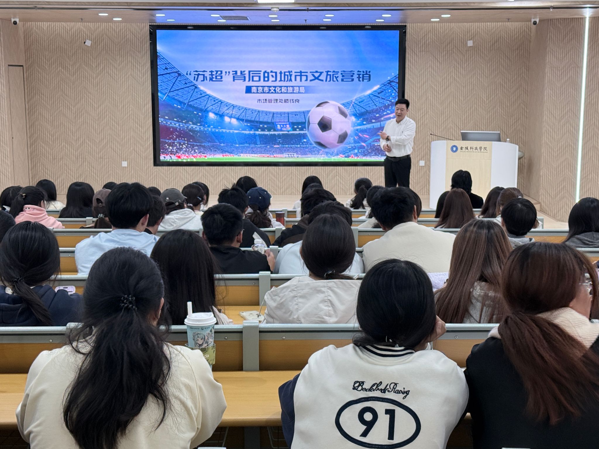 为拓宽学生求职视野,深化对文旅产业与体育赛事融合发展的理解,11月5日,外国语学院特邀南京市文化和旅游局市场管理处处长楼钱良来校,举办“‘苏超’背后的文旅营销”主题讲座。楼处长以生动鲜活的案例、幽默诙谐的语言及丰富的肢体表达,吸引了全院百余名师生到场聆听,现场气氛热烈,互动频繁。