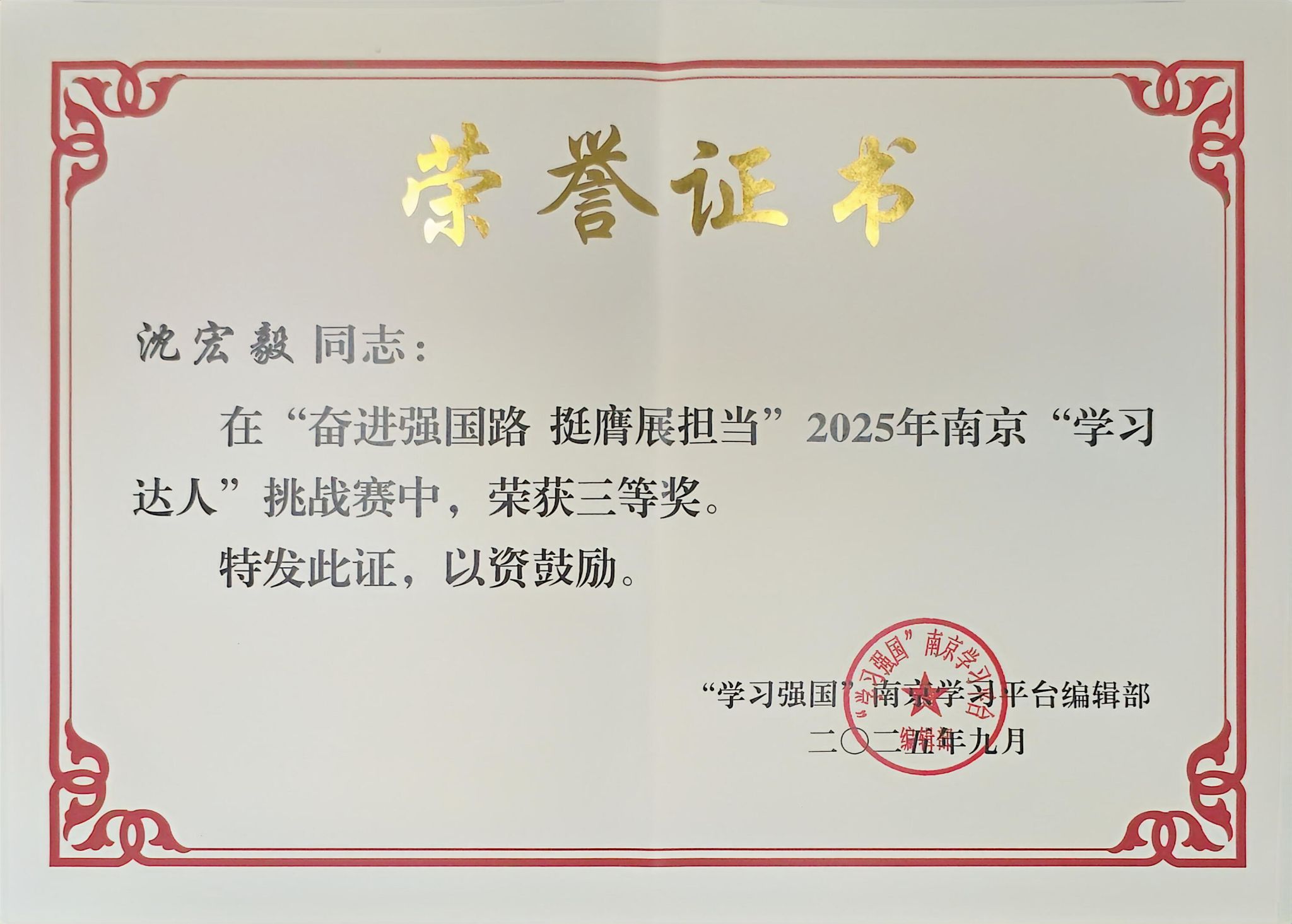 2025年9月,在“学习强国”南京学习平台编辑部主办的“奋进强国路 挺膺展担当”2025年南京“学习达人”挑战赛中,我院2023级计算机科学与技术专业学生沈宏毅凭借扎实的理论素养、出色的临场表现和积极向上的精神风貌,从众多参赛选手中脱颖而出,荣获三等奖,为学校赢得了荣誉。