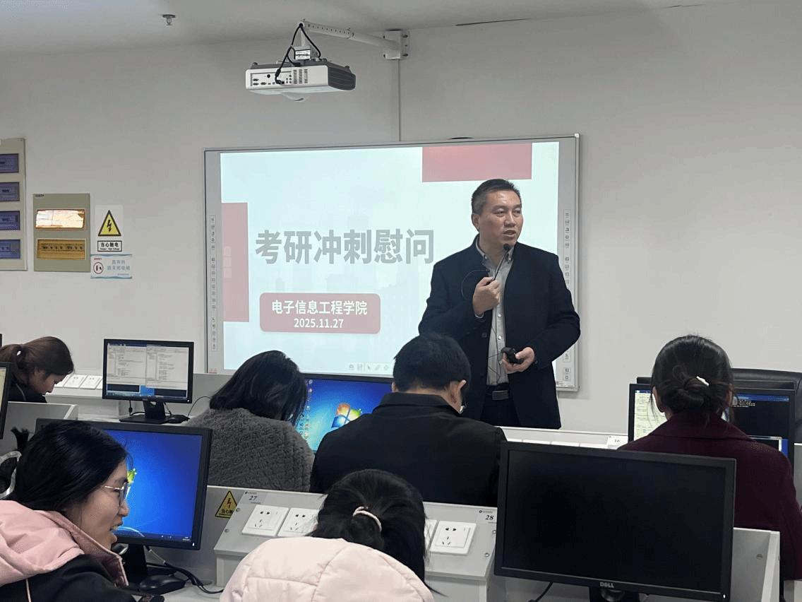 11月27日,电子信息工程学院精心组织开展“考研冲刺慰问”活动,为即将踏上2026年硕士研究生招生考试考场的学子们送上关怀与鼓励。学院党委书记徐志国、院长胡国兵、党委副书记陈智慧、副院长杨娟及辅导员郭晓出席了活动,全体备战考研的26届学生参与了活动。
