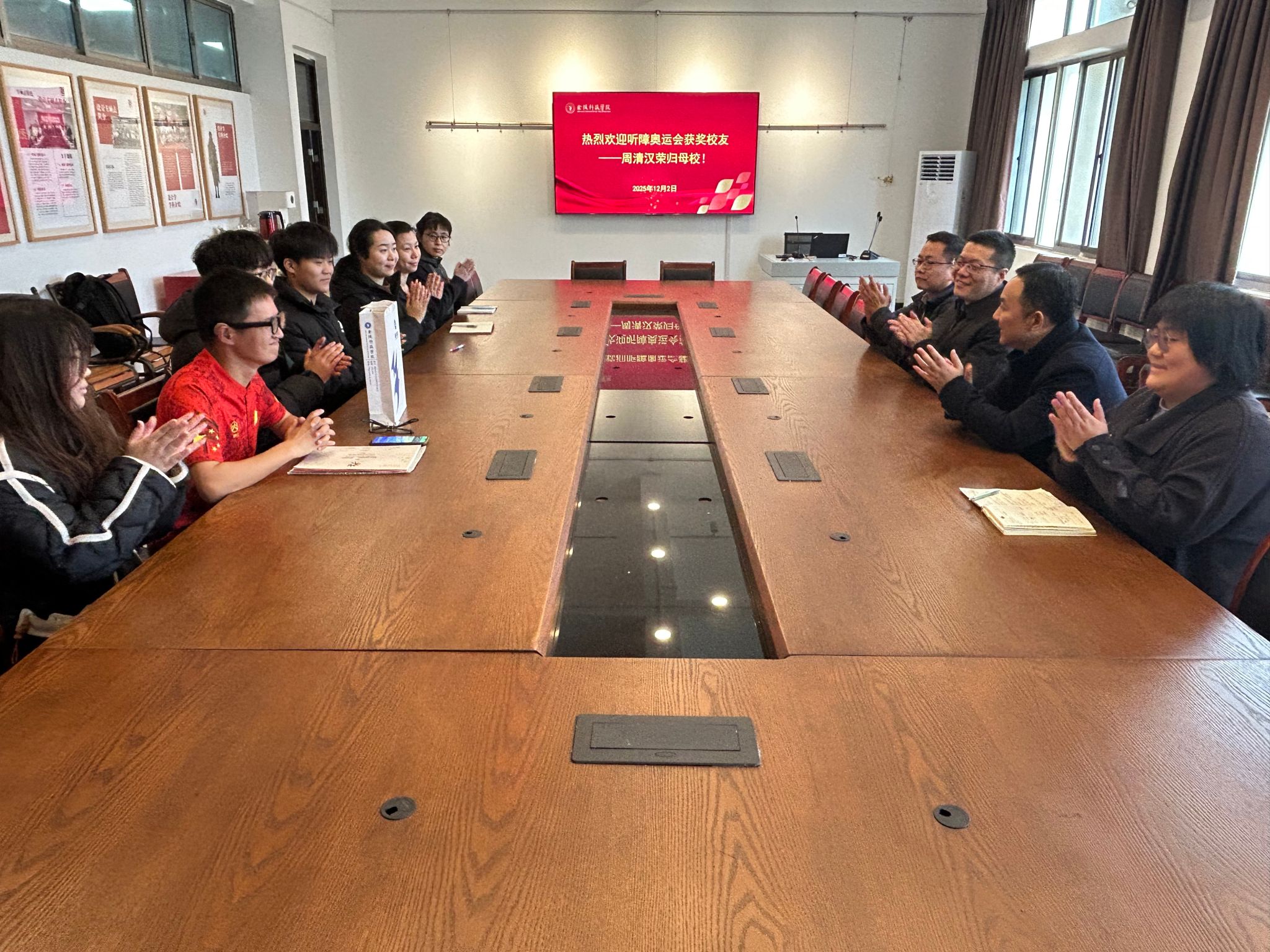 12月2日上午,我校2021届毕业生、中国国家听障定向越野队队员周清汉回到了母校体育部,与曾经指导过他的老师们重逢。体育部副主任沈辉,体育部直属党支部书记、体育部副主任周敏,指导教师罗歆歆,向他送上了热烈的祝贺与亲切的问候。沈辉副主任代表体育部对周清汉在第25届夏季听障奥运会上的优异表现表示高度肯定:“作为中国首批参加夏季听障奥运会定向越野项目的选手,你在东京赛场斩获男子接力赛第4名,不仅实现了个人突破,更填补了中国在该项目国际赛事中的空白,为母校争光,为国家添彩!”他强调,周清汉的拼搏精神生动践行了“让运动成为习惯,让生命更加精彩”的金科体育理念,是全体金科体育人的骄傲。