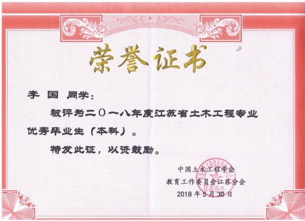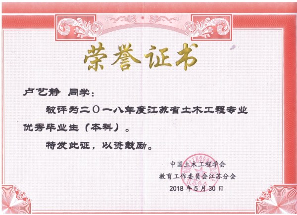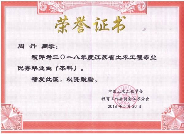 为激励江苏省土木工程专业学生刻苦学习,奋发向上,同时也为积极创造尊重知识,珍惜人才的良好社会环境,培养更多、更好的德、智、体全面发展的社会主义建设者和接班人,中国土木工程学会教育工作委员会江苏分会(简称江苏省土木工程教育委员会)授予我院李国、卢艺静、周丹三名同学2018年江苏省土木工程专业优秀毕业生称号。