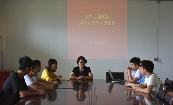 为了让应征入伍的同学们更加了解入伍的流程,坚定自己的信念,充分做好准备。2018年6月8日中午12:25,材料工程学院在工科楼会议室召开应征入伍学生交流会。材料工程学院党总支副书记陈智慧、辅导员王亚男出席本次会议。
