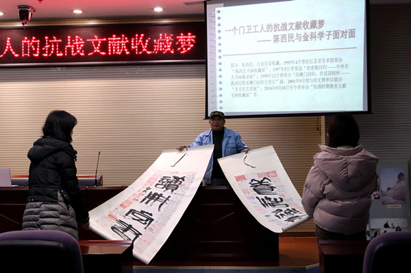 为了活跃校园文化氛围,12月28日下午2:00,在幕府校区图书馆报告厅举办了“一个门卫工人的抗战文献收藏梦”主题讲座活动,本次活动特邀著名收藏家陈西民,与金科学子面对面。人文学院院长顾金亮与各班级近百名同学参加了此次活动。