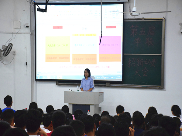 为给2018级新生提供一个锻炼自我,展示自我,提升自我的平台,同时也为学联充实优秀人才,确保学生工作可持续的良性发展。9月11日晚上六点半,网络与通信工程学院于7100开展了第五届学联招新动员大会。辅导员郑灵敏、辅导员孙成、学生党支部书记袁彩霞,第五届学联干部及18级全体新生共同参与了动员大会。