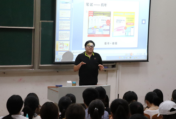 培训会上,孙老师首先就导游证考试的整体情况为同学们进行介绍,包括考试时间、考试项目分部以及今年新增考试内容等。对于面试环节,孙老师从分数构成进行了分析,占比分50%的景点讲解部分,他介绍了高效率的应对方法,并对容易出现的错误进行分项讲解。针对考官问题环节,孙老师则将四种考试题分类,将历年易考题目进行了重点讲解。孙老师层次分明的讲解和幽默风趣的风格,赢得了现场同学们的阵阵掌声。