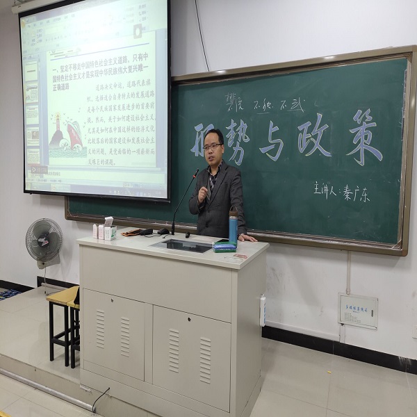 秦广东老师从时事新闻出发,以诙谐的语言及丰富的理论知识,配以声情并茂的演讲,令学生们理解到改革开放的重要性,并明晰改革开放40周年纪念会的意义,坚定学生们拥护共产党领导的决心。同学们反应热烈,积极探讨与笔记,,将知识化为己用,深刻理解到党对人民的爱护与重视,以及当前国际形势与政策和将来发展趋势。最后,秦老师针对此次主要内容进行总结,讲座在一片掌声中圆满结束。