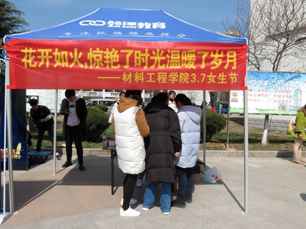 为丰富学生的校园文化生活,给同学们提供展现自我,展现青春风采的平台,材料工程学院于3月7日上午10点至下午5点在北区食堂门口举办以“花开如火,惊艳了时光温暖了岁月”为主题的全校性女生节公益活动。