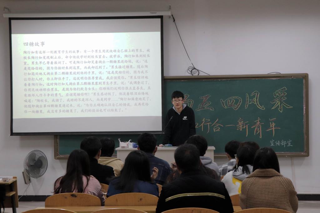 为纪念五四青年节,传扬五四精神,人文学院各团支部举办了“扬五四风采,做知行合一新青年”主题团日活动。2018级学生利用晚自习时间,借由《陶行知全集》一书学习先生的高尚的德行。