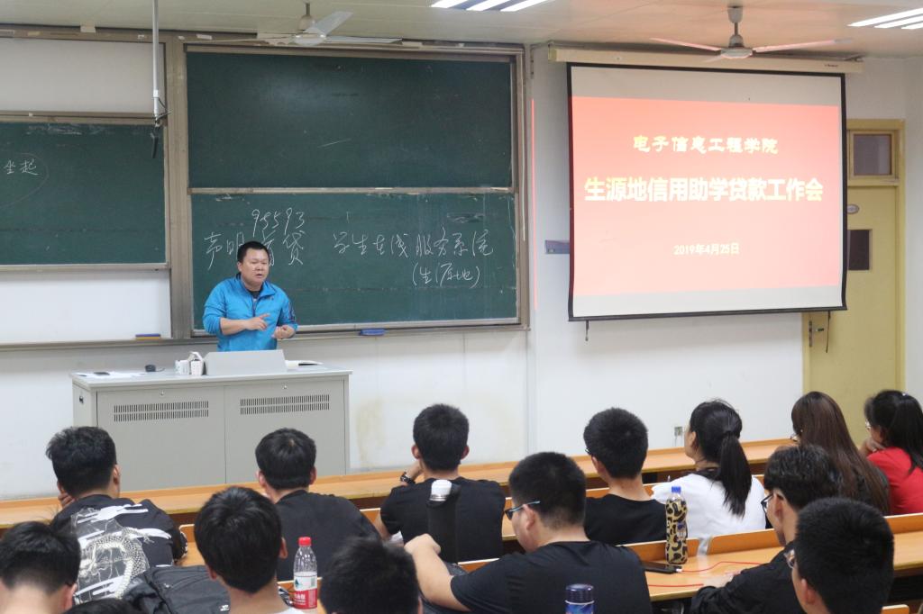 4月25日,电子信息工程学院在1432教室召开生源地信用助学贷款工作会。学生工作部(处)学生资助管理中心副主任曹轶蕾、学院辅导员邹文荣、学院资助中心成员、各班生活委员及需要申请助学贷款的同学参加了会议。