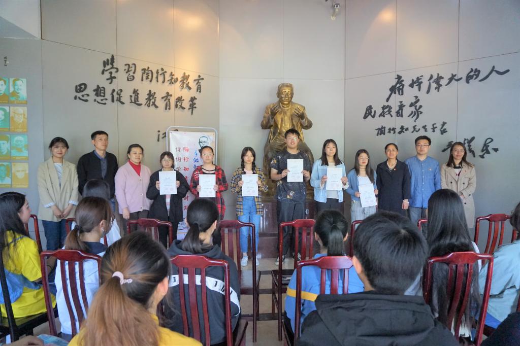 分享会伊始,马副馆长为同学们讲述了陶行知先生一生无私奉献,为教育“捧着一颗心来,不带半根草去”的事迹,亲切教导同学们做知行合一的新青年。自4月10日,我院各团支部开展了以“扬五四精神,做知行合一新青年”为主题的团日活动,同学们借由《陶行知全集》一书学习了先生的高尚德行,分享了学习心得。本次分享会上,特别为学习突出的6个团支部,颁发了荣誉证书,表彰同学们在品读陶行知先生诗词的同时,能从中汲取丰富的精神养料,关注社会生活,学会学习,焕发学生活力,做知行合一新青年。