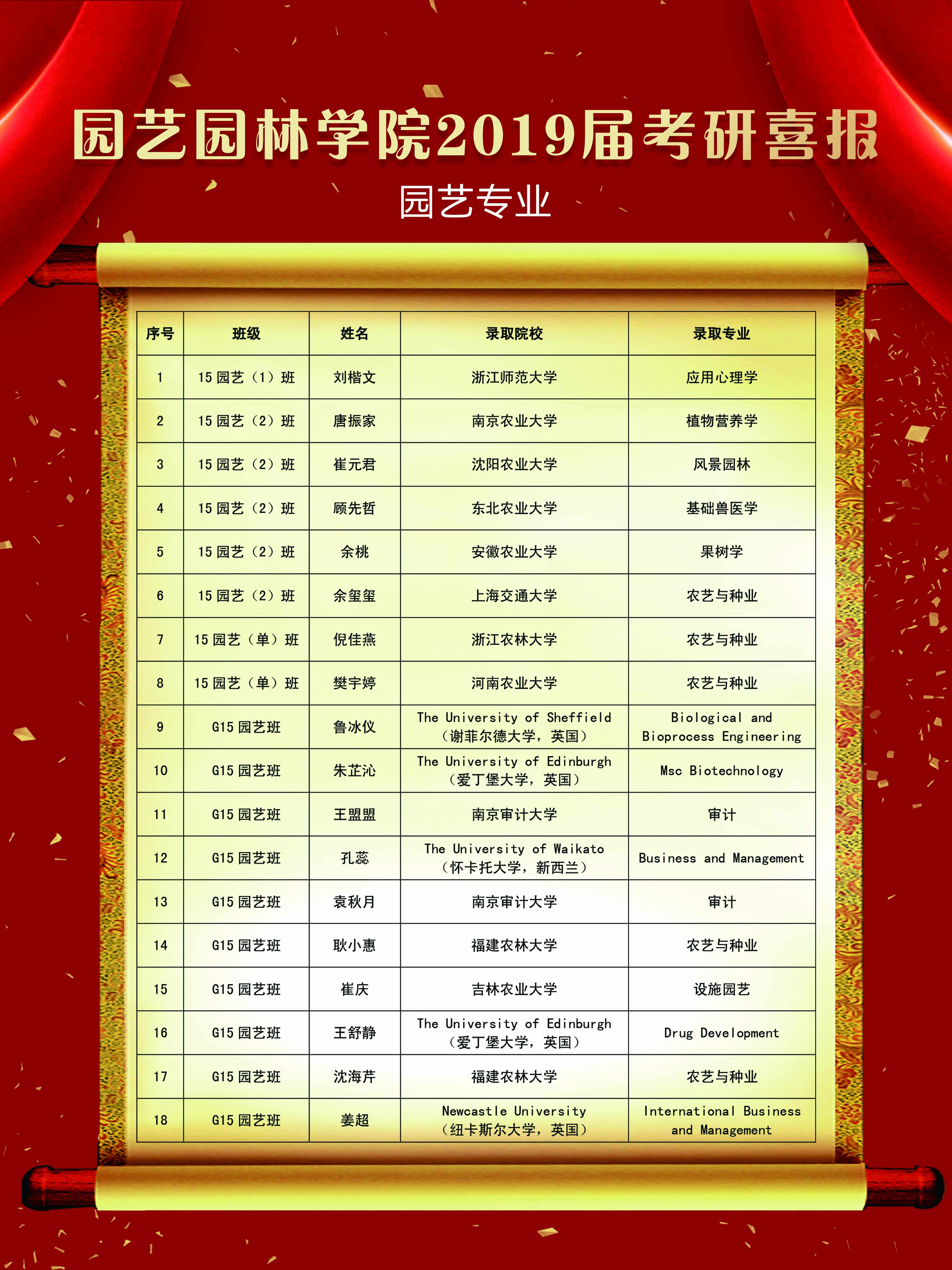2019届考研结果尘埃落定,我院考研学子喜讯频传,考研录取人数再创新高,共有60名学生考取硕士研究生。5月22日下午,园艺园林学院在图教楼B205隆重举办2019届考研表彰大会。院党委书记陈玉林,院党委副书记、院长宰学明,教师代表王长义,学工办甘黎明、徐敏、王淼老师,2019届考研录取学生,以及2016级、2017级、2018级学生代表近200人参加本次大会,会议由卞长林老师主持。