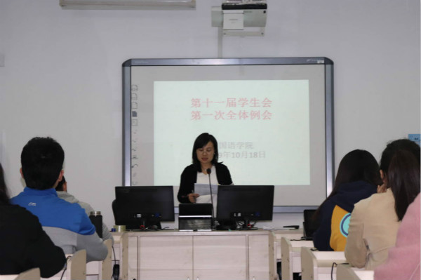 为了顺利开展本学期的学生活动,推进新老干事的工作交接,以更加优良的面貌迎接新学期,10月18日晚,外国语学院于8301教室召开了第十一届学生会第一次全体例会。参加本次会议的有学工办副主任王奕老师,团总支书记杨婷老师以及第十一届学生会全体成员,会议由第十一届学生会主席韩杰主持。