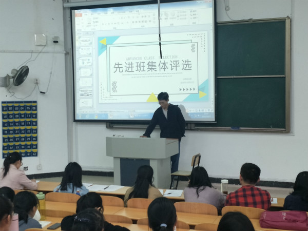 会议开始,学工办副主任王奕老师宣读了先进班集体评选标准以及评选会流程,并简单介绍了17级、18级四个参选班级的情况。接着,四位班长代表班级依次上台展示。四位班长结合精美的PPT,从班级概况、党团建设、班风学风、考级考证和实践活动等各方面对班级情况进行了精彩展示。经过评委现场打分,17英语(1)班获得2019年校级“先进班集体”荣誉称号。