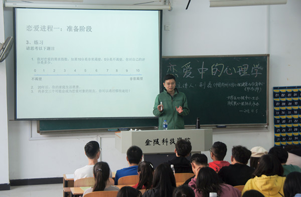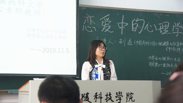 为了普及心理健康知识,促进同学们身心健康与全面发展,校学工处、商学院于11月5日在江宁校区5106教室举办“恋爱中的心理学”主题讲座。中国药科大学心理健康与教育中心荆磊老师应邀主讲,国家二级心理咨询师、商学院学工办心理辅导站负责人徐冰洁老师及各学院学生代表参加讲座。
