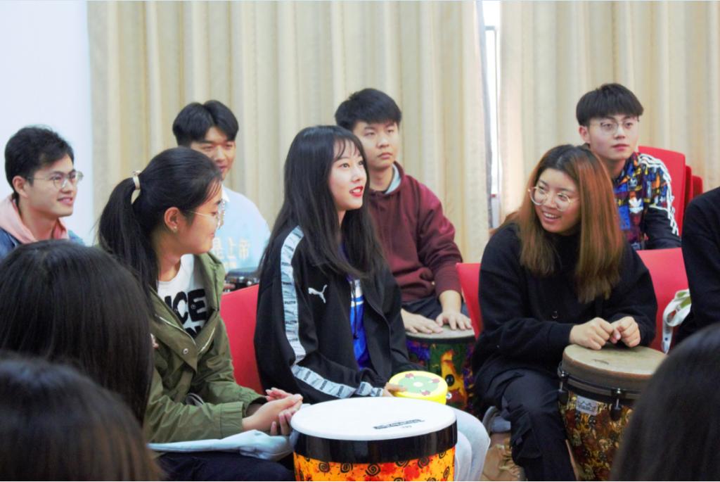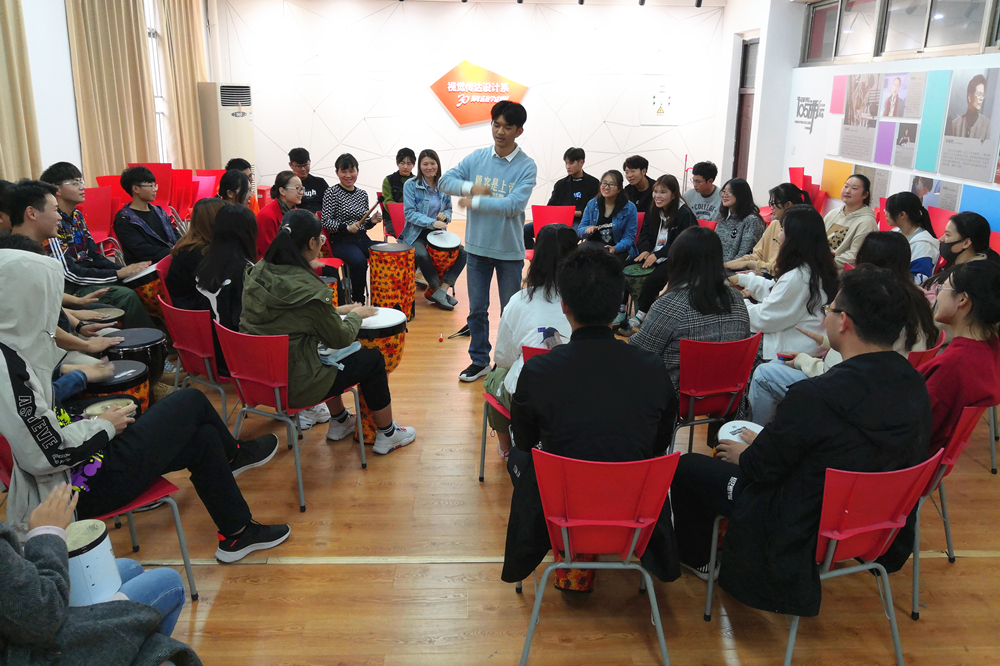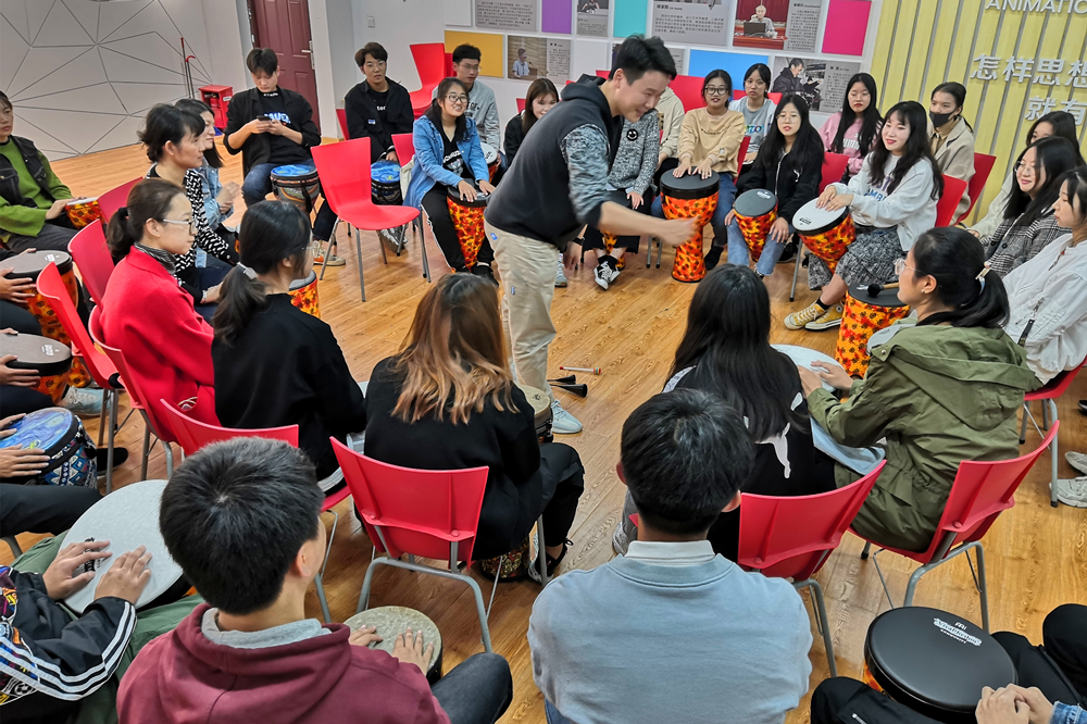 接下来,同学们围坐一圈,在音乐治疗师、专业一级鼓圈引导师朱晓红老师、候陈谦老师的带领下,开展了鼓圈心理活动。每位同学都领到了属于自己的鼓,看着老师演示每个鼓的用法后,大家也通过拍击感受鼓的独特音色。引导师用自己手中的打击乐器,附上自己的肢体语言,引导同学们参与到互动中来。渐渐熟悉以后,同学们也能够勇敢地站在鼓圈中间,成为活动引导者。每个人都可以随时加入合奏,大家齐心协力,共同完成了同一乐章。活动最后,引导师播放了一首轻音乐并进行积极的情绪放松,伴随着舒缓的音乐与老师的引导,同学们闭上眼睛开始冥想,仿佛打开了心门,很好地释放了心理压力。