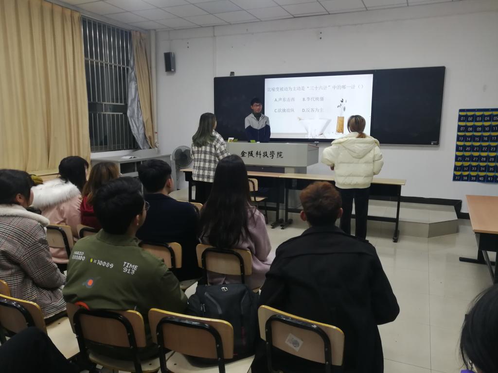 为了庆祝新中国成立七十周年,同时在学生中传播中华传统文化,践行文化自信道路,丰富大学生的精神生活,艺术学院于12月12日,在江宁校区8103教室举办校园版的“一站到底”知识竞赛,此次竞赛题库由新中国成立70周年相关知识及中国传统文化知识两部分构成。