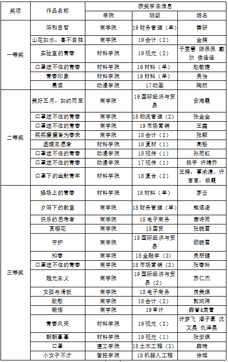 6月1日,由校心理中心主办,材料学院与智控学院联合承办的“口罩遮不住的青春”活动顺利结束,各学院学生踊跃投稿,经评选出一等奖6名,二等奖8名,三等奖15名。具体优秀作品如下: