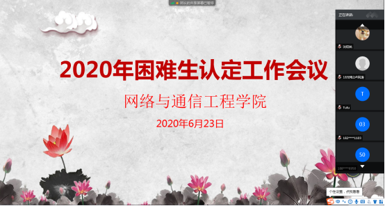 6月23日,网络与通信工程学院通过网络线上的方式,召开了2020年度困难生认定的工作会议,对困难生申请的系列问题进行了讲解。此次线上会议由学院负责资助工作的辅导员孙成老师主持,由17、18、19级的部分学生组成参与人员。