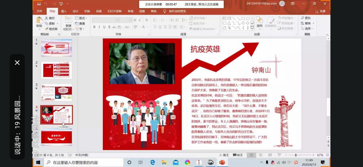 班会上通过视频讲述战“疫”先进典型事迹,故事中的每一个主人公都在给武汉这座城带来希望,正所谓城市有光就不会黑。他们怀着使命感,坚守工作,努力生活,发现自己的热爱。同学们发表了自己的感想,分享了身边的抗疫故事,这些真实的故事,让同学们感受到我们的安定生活背后离不开英雄们的付出。