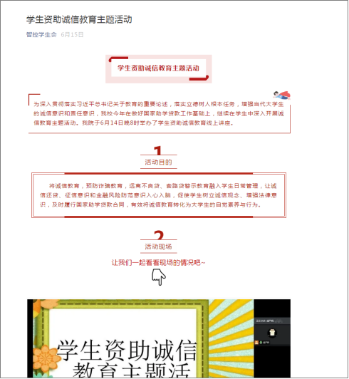 组织线上资助诚信讲座。6月14日,我院召开了以“诚信资助”为主题的线上讲座,本次讲座向同学们介绍了国家助学贷款及其它学校资助政策,通过中华民族的传统美德故事阐释了诚信的重要意义,辅导员王艳成向同学们进一步强调了在当下信息时代,诚信记录对于每个人的重要性,引导同学们牢固树立守信光荣、失信可耻的信用观念。