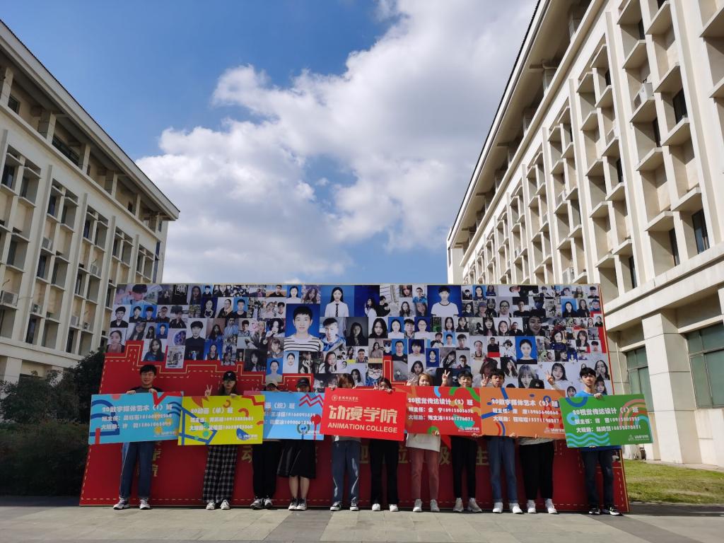 有广度的起点——教学楼前的大型照片墙。学院在7号教学楼前布置了大型照片墙,由学长学姐们将暑假里就收集齐的新同学照片予以设计呈现。每位新同学在报到之后,都可以与最萌的自己合影留念,一起站在动漫学院的人生新起点上。广阔的梦想起点,陪着新生们由此出发,走进丰富多彩的大学生涯。